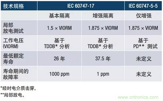 IEC 60747-17 (DIN V VDE V 0884-11)明確定義了采用感性和容性技術(shù)的絕緣,而公認(rèn)的IEC 60747-5-5標(biāo)準(zhǔn)則被用來(lái)定義采用光耦合器技術(shù)的絕緣。然而,IEC 60747-5-5沒(méi)有規(guī)定通過(guò)TDDB分析來(lái)確定連續(xù)工作電壓和使用壽命。它依賴局部放電電壓測(cè)試來(lái)確定工作電壓,但并未定義器件的工作壽命。因此,感性和容性技術(shù)的最低額定壽命為37.5年,而對(duì)光耦合器隔離器則未作規(guī)定。