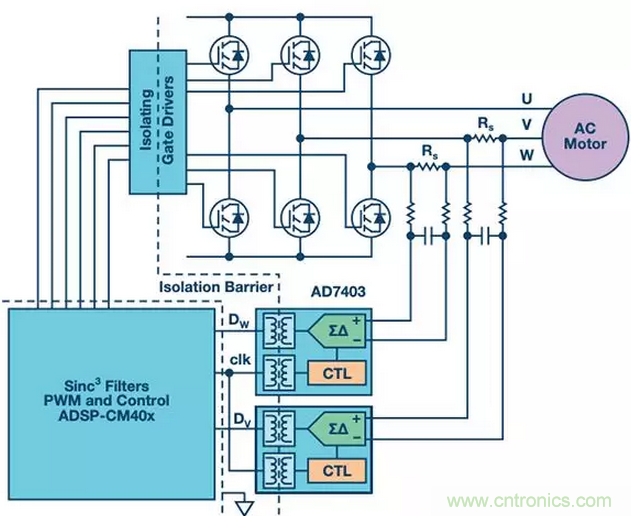 圖1所示為一個(gè)典型三相永磁電機(jī)驅(qū)動(dòng)系統(tǒng),其利用檢測(cè)電阻測(cè)量繞組電流,并通過(guò)ADI公司的AD7403隔離式Σ-Δ調(diào)制器和sinc3