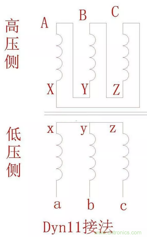 常見變壓器高壓側(cè)有三角形和星型接法,低壓側(cè)也有三角形或星型接法;這幾種接法相組合,加上高壓側(cè)和低壓側(cè)電壓形成一定的角度差;再加上高低壓側(cè)中性點(diǎn)有接地和不接地兩種方式,這就構(gòu)成了變壓器連接組別的所有要素。