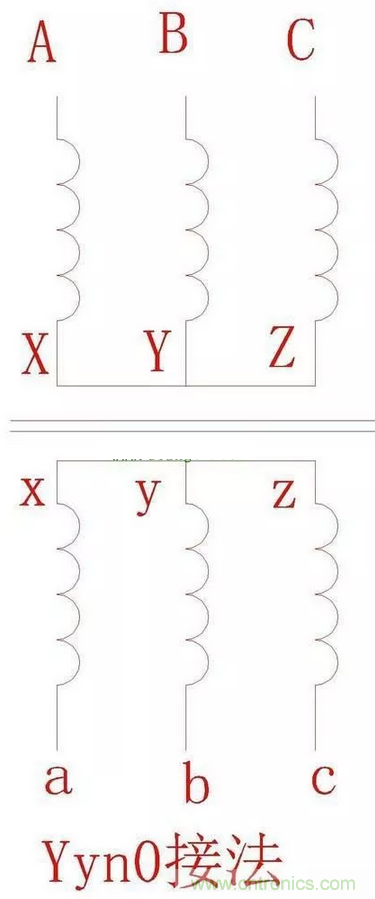 2.Yyn0的意義:Y:高壓側(cè)星型接法,無中性點(diǎn)引出;y:低壓側(cè)星型接法;n:中性點(diǎn)引出;0:高低壓差位差0度。