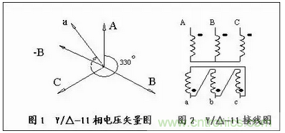 如圖1所示,Y/△-11的聯(lián)接組別,順時(shí)針旋轉(zhuǎn)了330°后再畫出次邊a相的相電壓矢量,此a相相電壓矢量在原邊A相與B相反方向-B的合成矢量上,由于原次邊三相繞組A、B、C和a、b、c相對(duì)應(yīng),我們把次邊a相繞組的頭連接次邊b相繞組尾,作為次邊a相的輸出線,由此在三角形接法中,只要確定了次邊a相的連結(jié),其他兩相的頭尾連接順序和引出線就不會(huì)弄錯(cuò)。因此根據(jù)原次邊相電壓矢量便可畫出Y/△-11組接線圖,如圖2所示。