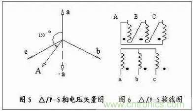 如圖5所示,先畫出△/Y-5組的矢量圖,再逆時(shí)針旋轉(zhuǎn)150°,畫出原邊A相相電壓矢量,此A相相電壓矢量上,因此根據(jù)此矢量圖便可畫出△/Y-5組的接線圖可知,次邊a、b、c三個(gè)頭作為a、b、c三相的輸出端,原邊A的尾C的頭,B的尾接A的頭,C的尾接B的頭分別作為A、B、C三相的輸出端,見圖6。