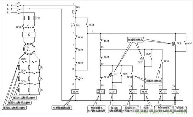 轉子回路中的3組啟動電阻,由接觸器2KM、3KM、4KM在時間繼電器1KT、2KT、KT3的控制下被順序短接;在正常工作時,只有接觸器1KM和2KM的主觸點閉合。