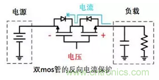 如下所示,利用2個MOS管背靠背地連接是一個不錯的解決方案。當2個MOS管關閉,它們可以阻斷兩個方向電流的流通。與二極管的解決方案相比,MOS管可以支持更低的電源壓降供應給負載。但是,如果要實現這種方案,需要多個元器件配合,使得電路會在電路板上占用更多的空間。