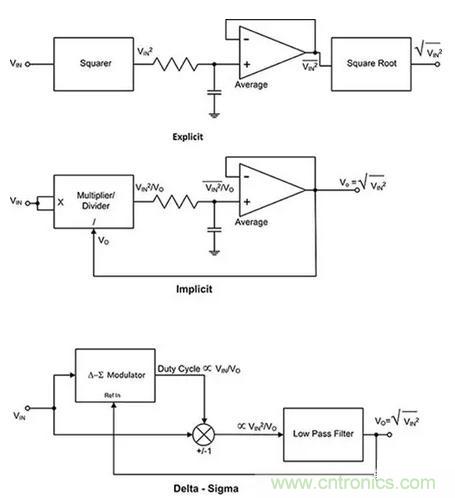圖2:測量波形的RMS值有三種不同的方法:顯式、隱式和三角積分電路拓?fù)洹#▓D片來源:Digi-KeyElectronics)