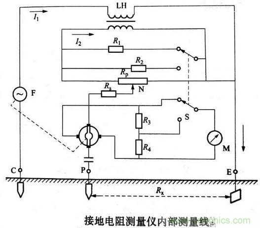 接地電阻測量儀由手搖發電機F、電流互感器LH、倍率開關S、調節電位器Rp及檢流計M等組成,全部機構裝在塑料殼內,外有皮殼便于攜帶,附件有輔助探棒、導線等,其內部測量線路如下圖所示。