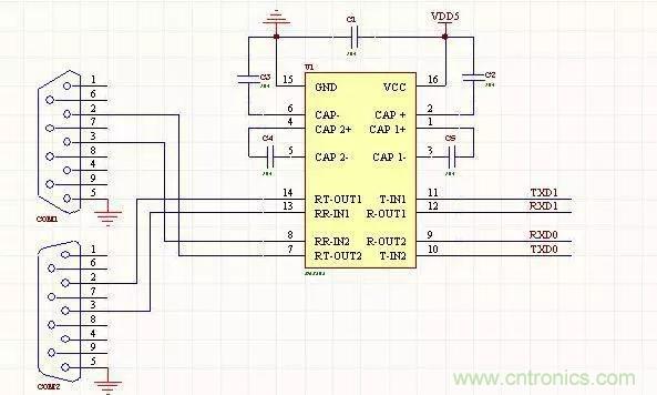 1、雙路232通信電路3線連接方式,對應的是母頭,工作電壓5V,可以使用MAX202或MAX232.