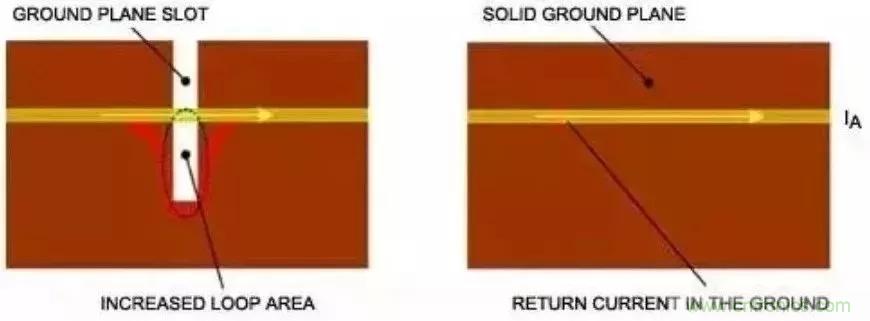 返回電流通路須盡可能靠近主電流通道,將輻射磁場降至最小。這種布局有助于減小電流環(huán)路面積。返回電流的理想低阻通路通常是引線下方的接地區(qū)域—將環(huán)路面積有效限制在電介質厚度乘以引線長度的區(qū)域。但是,如果接地區(qū)域被分割開,則會增大環(huán)路面積(圖3)。對于穿過分割區(qū)域的引線,返回電流將被強制通過高阻通路,大大提高了電流環(huán)路面積。這種布局還使電路引線更容易受互感的影響。