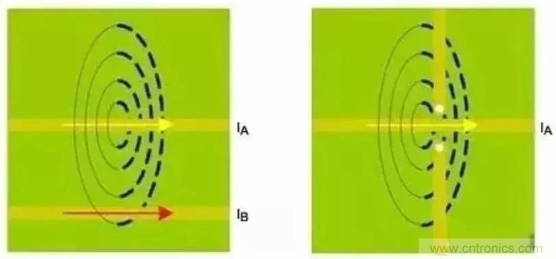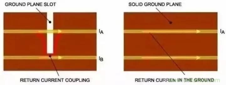 直流電流總是傾向于沿著低阻通路流通。同理,高頻電流也是優(yōu)先流過最低電阻的通路。所以,對于地層上方的標準PCB微帶線,返回電流試圖流入引線正下方的接地區(qū)域。按照上述引線耦合部分所述,割斷的接地區(qū)域會引入各種噪聲,進而通過磁場耦合或匯聚電流而增大串擾(圖7)。
