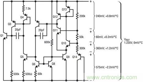將此電壓施加到基極之間連接的50k電阻,產(chǎn)生一個(gè)與溫度成比例的電流。該電流偏置二極管Q14,25°C時(shí)其電壓為575mV,溫度系數(shù)為-2.2mV/°C。電阻用于產(chǎn)生具有正溫度系數(shù)的壓降,其施加到Q14二極管電壓上,從而產(chǎn)生大約1.235V的基準(zhǔn)電壓電位,理論上溫度系數(shù)為0mV/°C。這些壓降如圖5所示。電路的平衡提供偏置電流和輸出驅(qū)動(dòng)。