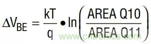 基本帶隙基準(zhǔn)電壓源背后的數(shù)學(xué)原理很有意思,因?yàn)樗鼘⒁阎獪囟认禂?shù)與獨(dú)特的電阻率相結(jié)合,產(chǎn)生理論上溫度漂移為零的基準(zhǔn)電壓。圖5顯示了兩個(gè)晶體管,經(jīng)調(diào)整后,Q10的發(fā)射極面積為Q11的10倍,而Q12和Q13的集電極電流保持相等。這就在兩個(gè)晶體管的基極之間產(chǎn)生一個(gè)已知電壓: