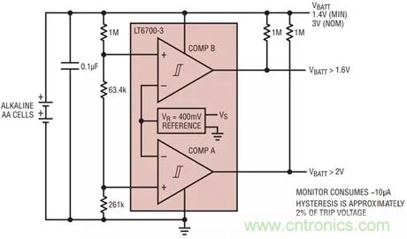 LT6700(圖7)和LT6703是集成度更高的解決方案,其將400mV基準(zhǔn)電壓源與比較器相結(jié)合,可用作電壓監(jiān)控器或窗口比較器。400mV基準(zhǔn)電壓源可以監(jiān)控小輸入信號(hào),從而降低監(jiān)控電路的復(fù)雜性;它還能監(jiān)控采用非常低電源電壓工作的電路元件。如果閾值較大,可以添加一個(gè)簡單的電阻分壓器(圖8)。這些產(chǎn)品均采用小尺寸封裝(SOT23),功耗很低(低于 10μA),支持寬電源范圍 (1.4V 至 18V)。此外,LT6700 提供 2mm x 3mm DFN 封裝,LT6703 提供 2mm x 2mm DFN 封裝。