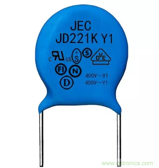 Y電容通常都是陶瓷類電容器,一般成隊出現,多數是扁圓形外觀,顏色呈現藍色,能夠抑制共模干擾,Y電容容量是nF級。基于漏電流的制約,Y電容量不可很大。Y電容多數適用于隔離場合,按照IEC標準,Y1產品電氣間隙最小為8.0㎜,Y2產品電氣間隙不低于6.3㎜,作為隔離產品,安全距離要做夠,避免高壓通電發生拉弧現象。