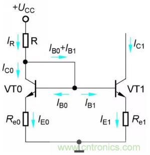 如圖2所示為比例恒流源電路,它由兩只特性完全相同的管子VT0和VT1構成,兩管的發射極分別串入電阻Re0和Re1。比例恒流電路源改變了IC1≈IR的關系,使IC1與IR呈比例關系,從而克服了鏡像恒流源電路的缺點。