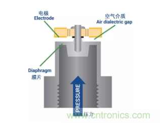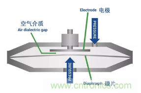 簡單地說,這些壓力傳感器是一種電容器,一種具有充電能力的裝置。當壓力作用到傳感器內部的膜片上時,膜片就會收縮,或向固定電極彎曲,并改變電容。這種物理變化會導致電子輸出的變化,該裝置可將壓力讀數轉換成電流或電壓值。