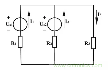 【例1】如上圖所示電路是汽車上的發電機(US1)、蓄電池(US2)和負載(R3)并聯的原理圖。已知US1=12V,US2=6V,R1=R2=1Ω,R3=5Ω,求各支路電流。