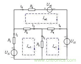 2) 若有m條支路,根據基爾霍夫電壓定律列(m-n+1)個的獨立回路電壓方程。為了計算方便,通常選網孔作為回路(網孔就是平面電路內不再存在其他支路的回路)。對于平面電路,獨立的基爾霍夫電壓方程數等于網孔數。