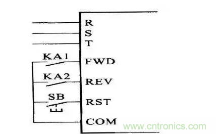3、找到變頻器的控制端子,在外面加裝2個中間繼電器,分別是KA1與KA2,接線方法如下圖所示,KA1工作時,變頻器正轉(zhuǎn),KA2工作時,變頻器反轉(zhuǎn),SB是復(fù)位按鈕,當有異常報警時,變頻器會停機,此時按下RST,可以消除報警,然后再重新啟動變頻器。