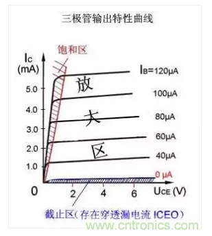 當IB很大時,IC變得很大,不能繼續隨IB的增大而增大,三極管失去放大功能,表現為開關導通。
