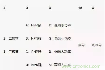不同的國家/地區對三極管型號命名方式不同。還有很多廠家使用自己的命名方式。