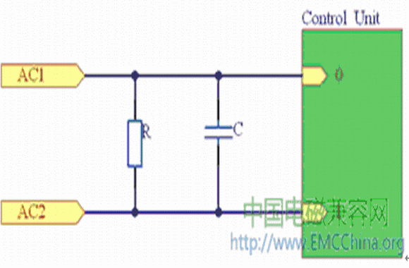 為了防止控制板電路產生的傳導干擾,可在電路的進入口(即AC兩端)并接上一個電容C,圖1所示是一個簡單的電容抗擾電路連接圖。圖中的電容屬于安全電容,但必須在該電容的兩端并聯一個安全電阻,以防止電源線拔插時電源線插頭長時間帶電。因為安全標準規定,當正在工作之中的機器電源線被拔掉時,在兩秒鐘內,電源線插頭兩端所帶的電壓(或對地電位)應小于原來電壓的30%。