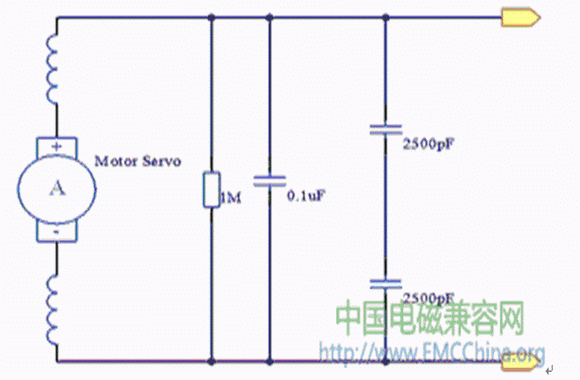 該電路的目的是為干擾電勢提供一個低阻抗的通路,以抑制干擾值。圖2中,C1為電感成分較小的電容,一般為幾十至幾百納法;C2選穿心電容,一般為1~4.7 nF。增加該電容的目的是為了抑制噪聲,但電容的安裝位置不同,以甚高頻段的干擾抑制效果會有很大變化,所以,安裝時要特別注意電容的接地外殼應與電動機座或金屬外殼的最短連接。同時應在連線時使電容器的輸入、輸出部分的電磁耦合盡可能地減少。