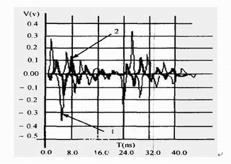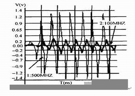 干擾源信號頻率越高,被干擾對象上的串擾幅值越大,我們對圖1中干擾源網絡AB上的信號頻率f1分別取不同頻率值時,對被干擾對象上的串擾進行了仿真,仿真結果見表2,信號頻率不同時的串擾波形見圖5,標記為“1”、“2”箭頭所指的波形頻率分別為“500MHz”、“100MHz”。