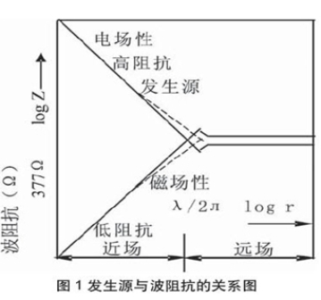如將發生源與觀察點之間距離定為r;RX=λ/2π,則在近場中,當發生源主要為電場時:
