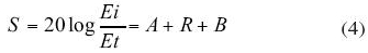 其中:A為厚度為t的屏蔽板內電磁波傳輸中的損耗;B為反射損耗系數;R為入射損耗系數;S的單位為dB。