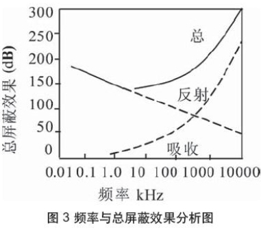 吸收損耗與屏蔽介質厚度成正比,與集膚深度成反比。從頻率角度看,吸收損耗隨頻度增加而增加,這是由于集膚深度隨頻率增加而減小造成的。反射損耗從圖3可以看出將隨頻率增加而降低,而吸收損耗隨頻率的增加而增加,最小的屏蔽效果出現在中頻頻率。對于低頻平面波的大量衰減是由于反射損耗,而高頻時大量損耗是由于吸收損耗。
