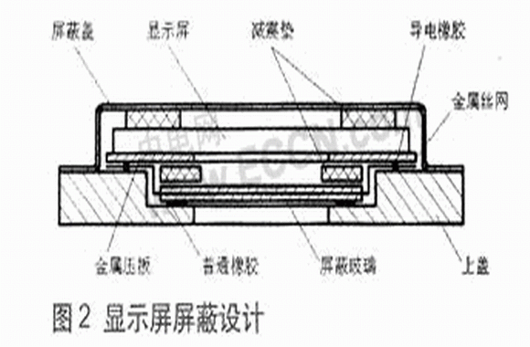 屏蔽玻璃安裝完畢,待粘膠涼干后再裝顯示屏。為了防止終端內(nèi)部電路的干擾,最后用屏蔽蓋把顯示屏包圍起來(lái)。顯示屏的屏蔽結(jié)構(gòu)如圖2所示。