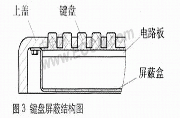 本終端鍵盤采用硅橡膠專用鍵盤,安裝在上蓋表面,開(kāi)口較多,易引起電磁泄漏,降低屏蔽效能。因?yàn)榭卓p對(duì)電磁波的衰減與干擾波波長(zhǎng)及孔縫尺寸有關(guān),一般應(yīng)使孔洞的尺寸遠(yuǎn)小于電磁波的波長(zhǎng),只要孔縫的直徑足夠小,就能夠達(dá)到所要求的屏蔽效能。但一般按鍵的大小、排列應(yīng)符合人們的操作習(xí)慣,按鍵太小使用不方便,故這里主要采取安裝屏蔽罩的方法來(lái)減少電磁泄漏。鍵盤的屏蔽結(jié)構(gòu)設(shè)計(jì)如圖3所示。
