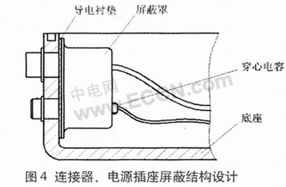 終端的通信連接器及電源輸入插座安裝在底座側(cè)面,需要在側(cè)面開(kāi)口。為防止在開(kāi)口處形成電磁泄露,可以在這些元件的后面裝屏蔽罩,穿過(guò)屏蔽罩的引線加裝穿心電容,焊接時(shí)引線通過(guò)穿心電容穿過(guò)屏蔽罩與元件相連。對(duì)于引入的電源插座,采用穿心電容實(shí)現(xiàn)電磁屏蔽。