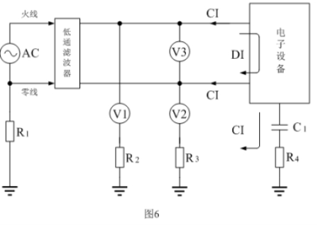 傳導干擾一般是通過電壓或電流的形式在電路中進行傳播的,圖6是測試電子設備產生傳導干擾的基本方法,或表示傳導干擾通過電源線傳輸的幾種方式。圖6中,電子設備表示干擾信號源,CI表示共模干擾信號,DI表示差模干擾信號;V1、V2、V3分別表示用儀表對干擾信號進行測量的連接方法,低通濾波器是為了便于對V1、V2、V3進行測試,而另外加接進去的;R1、R2、R3、R4分別為各電子設備的接地電阻,也包括大地之間的電阻,接地電阻一般為幾歐姆到幾十歐姆,其阻值與地線的安裝和地表面土壤結構有關;C1為電子設備對大地的電容,其容量與電子設備的體積還有地面距離有關,一般為幾微微法到幾千微微法。從圖6中我們可以看出: