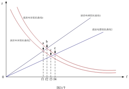 圖16表示C5電容與L0、L1、L2等電感濾波器的頻率-阻抗特性圖。圖16中紅線表示設備對地電容C5的頻率阻抗曲線;藍線是濾波電感L0、L1、L2的頻率阻抗曲線。