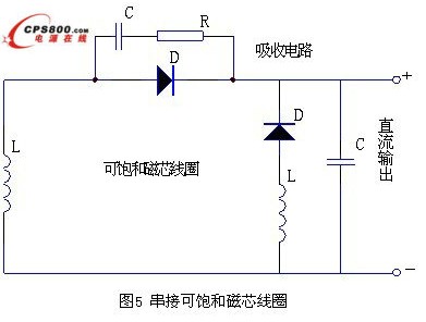 二次整流回路中,與整流二極管D串接可飽和磁芯的線圈,如圖5所示。可飽和磁芯線圈在通過正常電流時磁芯飽和,電感量很小,不會影響電路正常上作。一旦電流要反向時,磁芯線圈將產生很大的反電動勢,阻止反向電流的上升。因此,將它與二極管D串聯就能有效地抑制二極管D的反向浪涌電流。