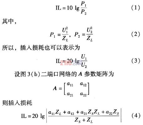 插入損耗是評價濾波器性能的主要指標,它是頻率的函數。插入損耗的定義為,沒有濾波器接入時,從噪聲源傳輸到負載的功率P1和接入濾波器后噪聲源傳輸到負載的功率P2之比,用dB表示。插入損耗越大,說明濾波器抑制干擾的能力越強。濾波器接入前后的電路圖,如圖3(a)和圖3(b)所示。濾波器的插入損耗由式(1)表示。