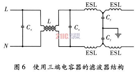 線路旁通電容Cy是用來消除高頻噪聲的組件,基于對今后開關操作頻率的高頻化考慮,宜選用能消除頻率高達1000MHz噪聲的電容器。而一般的兩端結構的旁通電容器僅能消除30MHz左右的噪聲。由以上介紹可知,相對兩端電容器來說,三端電容器能更好地抑制高頻噪聲。以EMI濾波器的一般結構為基礎,用三端電容器替代其中的兩端旁通電容Cy,電路圖,如圖6所示。其中ESL為三端電容器信號線上的等效串聯電感。