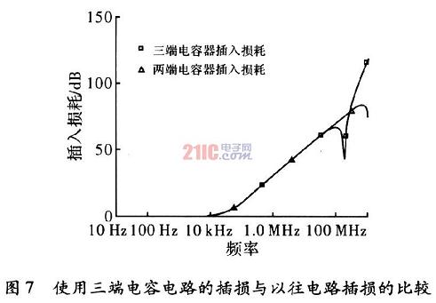 取差模電容Cx為0.1μF,共模電容Cy為2200pF,共模電感L取8mH。三端電容的等效串聯電感ESL取0.36nH。在50 Ω/50 ΩQ系統中分別對一般結構的EMI濾波器和使用了三端電容器的EMI濾波器的插入損耗進行PSpice仿真。如圖7所示,EMI濾波器在使用三端電容時,諧振點之后的插損效果明顯好于在濾波器中使用兩端電容的插損。提高了濾波器在高頻段的性能。