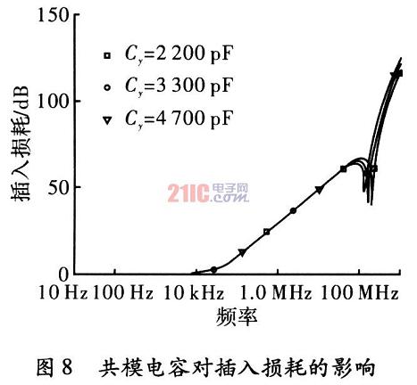 在使用三端電容的濾波器電路中,輸入阻抗和輸出阻抗都取50時,分別取共模電容Cy為4700pF,3300pF和2200pF,其他參數不變,觀察共模電容Cy變化時對插入損耗的影響。通過圖8的仿真結果看出,隨著共模電容的增大,在高頻段插入損耗有所提高,并且濾波器諧振點降低;而在低頻段基本沒有變化。因此可以通過選擇較大的共模電容來提高濾波器高頻段的插入損耗。由于共模電容需要接地,有漏電流,Iid的存在,對人身安全存在威脅。而共模電容越大,漏電流越大,所以選擇共模電容時需要在漏電流滿足安全條件的情況下取值。