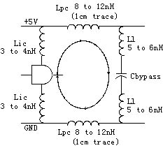 圖5為電流環(huán)的模型。從電流環(huán)模型中我們可以看出,環(huán)路中存在寄生電感,它們在高頻狀態(tài)下表現(xiàn)為環(huán)路的阻抗可導(dǎo)致供給電源產(chǎn)生尖峰,并會輻射電磁波從而干擾系統(tǒng)的其他部分。環(huán)路中Ll為電容管腳引線的封裝電感;Lpc為電容管腳到器件電源或者地管腳之間的PCB傳輸線的寄生電感;Lic為器件管腳引線的寄生電感。另外,在前面我們討論過電容本身也是具有寄生電感ESL的。這樣回路的總電感為:L=2Ll+2Lpc+2Lic+ESL。由于環(huán)路的寄生電感將會給整個系統(tǒng)帶來電磁干擾,產(chǎn)生電壓尖峰,這個電壓尖峰值同串聯(lián)電感之間存在一定的關(guān)系,近似計(jì)算公式如下: