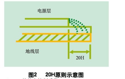 為了減小電源的邊緣輻射,電源/地平面應遵循20H設計原則,即地平面尺寸比電源平面尺寸大20H(見圖2),這樣邊緣場輻射強度可下降70% 。