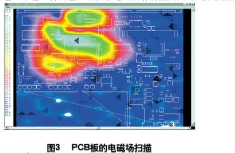 利用電磁輻射掃描儀,對裝聯并上電后的機盤掃描,得到PCB中電磁場分布圖(如圖3,圖中紅色、綠色、青白色區域表示電磁輻射能量由低到高),根據測試結果改進PCB設計。