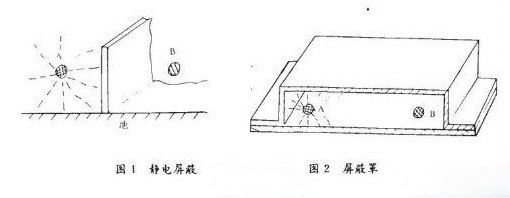 屏蔽方法:將一塊金屬板置于兩個被屏蔽的電路中間,并使各金屬板與地作電氣連接,如圖1所示。這樣從一點發出的電力線均被屏蔽板擋住,即起到靜電屏蔽作用。