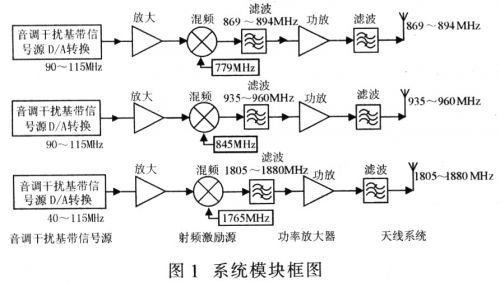 該系統由音調干擾基帶信號源(產生音調干擾基帶信號),射頻激勵源(對音調干擾基帶信號上變頻產生音調干擾信號),功放(對音調干擾信號進行功率放大),天線(發射干擾信號至干擾目標)等部分組成。圖1為系統模塊框圖。