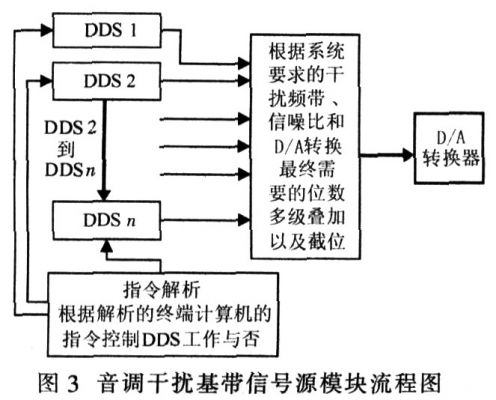 以0.02 MHz為步進產生梳狀譜為例,根據系統選擇的基帶頻譜的范圍、信噪比依次產生450個以上的DDS,該DDS的時鐘頻率大于等于500 MHz,且受指令控制。當FPGA根據終端計算機發送的指令解析為某段頻率為本方通信頻率時,關斷該段頻率對應的所有DDS。最后FPGA將所有DDS產生的頻點疊加輸出到D/A轉換器,經過D/A轉換器送入前端混頻器。該方案的優點是:干擾各個通信頻點,而不是整個頻帶,即使有較嚴重的交調,但是其在該干擾點上的輸出功率較整頻帶干擾方式還是大得多,并且功放較為容易計算所需功率。這種方式在終端計算機中需根據指令實時運算相應干擾參數,幾乎可以選擇任意可干擾和可開窗頻段,且信噪比可達很高,不受控制激勵模塊硬件資源的限制嘲。圖3為音調干擾基帶信號源模塊的流程圖。