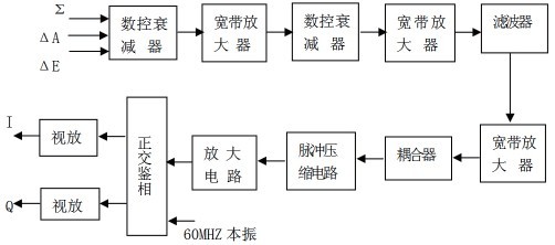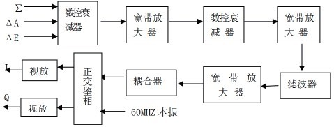視頻接收組合是由I/Q正交鑒相器和視頻放大器組成。其中應(yīng)用數(shù)控衰減器實時調(diào)整各路本振信號的相位,以達(dá)到補(bǔ)償接收機(jī)系統(tǒng)相位一致性的目的。最后輸出反射和應(yīng)答的12路I/Q信號以及反射和應(yīng)答的檢波信號。