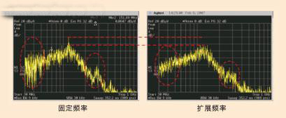 從圖中可見,在處理D類固有的周期性方波時,最基本的難題是諧振間隔時出現的集中能量。為了設計一個“安靜”的低EMI D類放大器,一個方法是將頻率來回抖動,或擴展開關的頻譜,降低頻譜內所有點上的能量。與傳統的D類放大器相比,擴頻調制方案有幾個重要的優點:除了可保持高效效率和低THD+N外,更重要的是大幅削減了輻射噪聲和EMI,如圖6中所示。