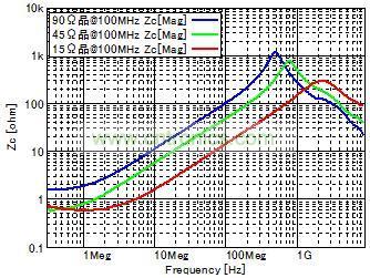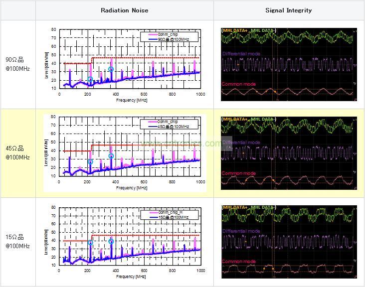 使用共模扼流線圈時的靜噪效果及信號波形評測圖5顯示的MHL信號線使用各種共模扼流線圈時的輻射噪聲/信號波形評測結果。共模扼流線圈在產(chǎn)生噪聲的30MHz~1GHz頻率段內(nèi),按照阻抗由高到低的順序,分別使用以下3種類型(90Ω、45Ω、15Ω@100MHz) (靜態(tài)特性請參考圖6) 來進行測量。