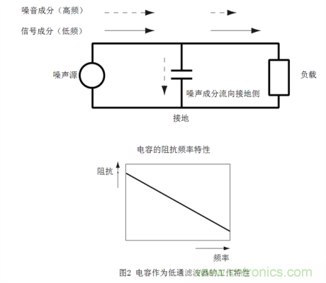 低通濾波器如果要利用該特性,就需要將電容插入噪聲通道與地線之間。如此一來(lái),低頻信號(hào)能夠照常通過(guò),高頻噪聲成分因接地側(cè)的阻抗較低,將流向接地側(cè),從而達(dá)到降噪效果。
